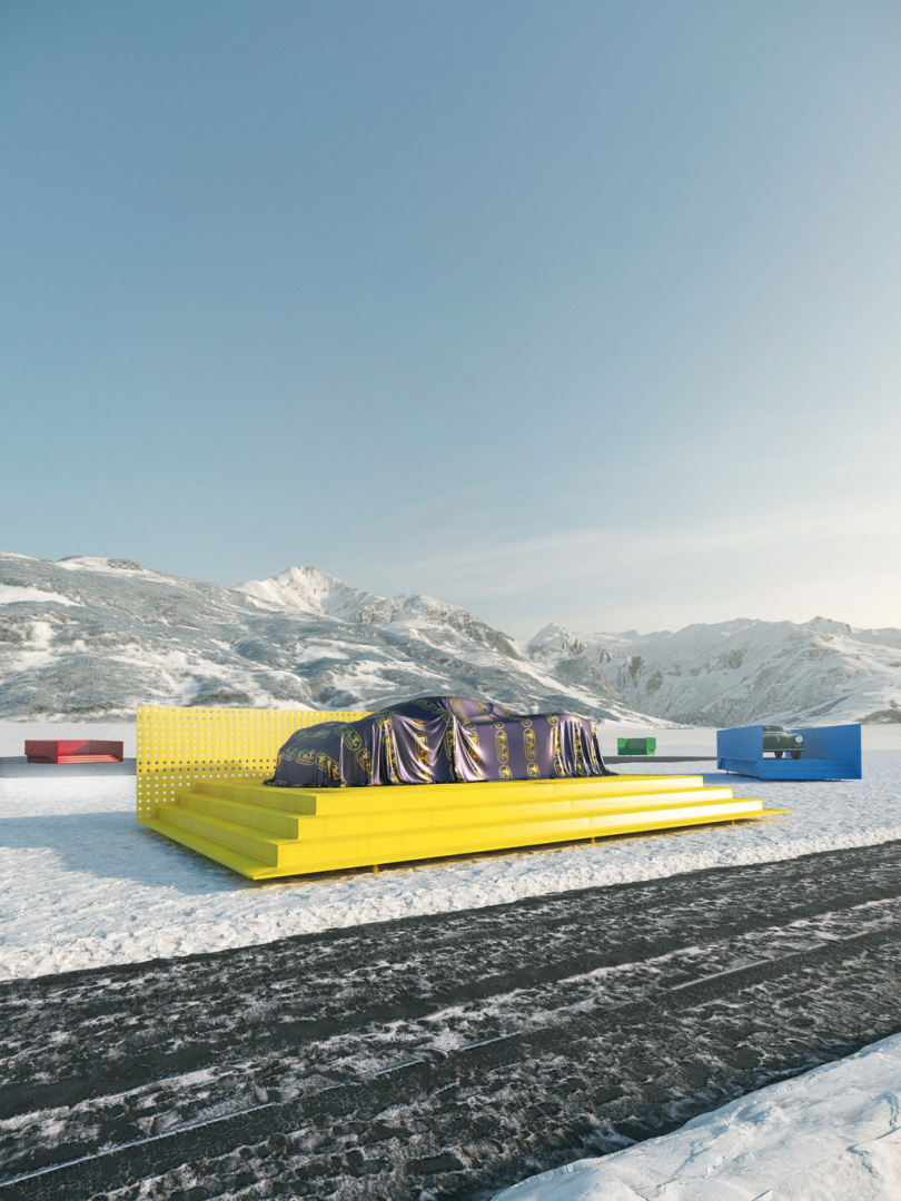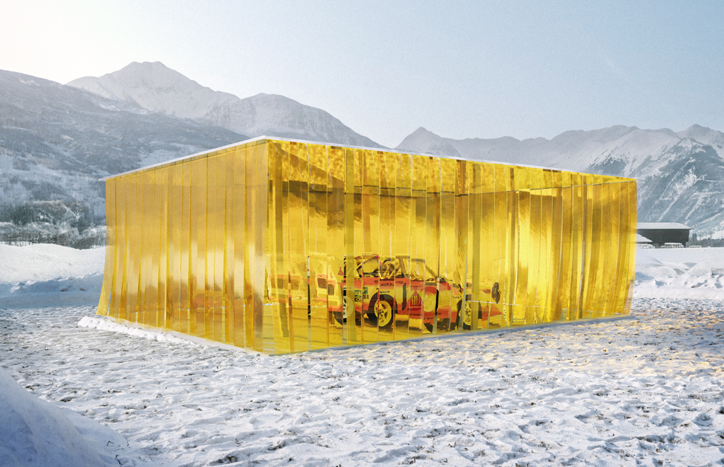 The aesthetics of the mehcanic's shop and the express carwash are exploited in this automobile-related pavilion. The artificiality of the yellow plastic bands contrast sharply with the beauty of a snowy landscape. One goes in and out in the same way a vehicle leaves an industrial facility. Plastic helps regulate temperature inside, and is transluscent enough to let both light in during the day but also turns this pavilion into a latern when the sun sets.